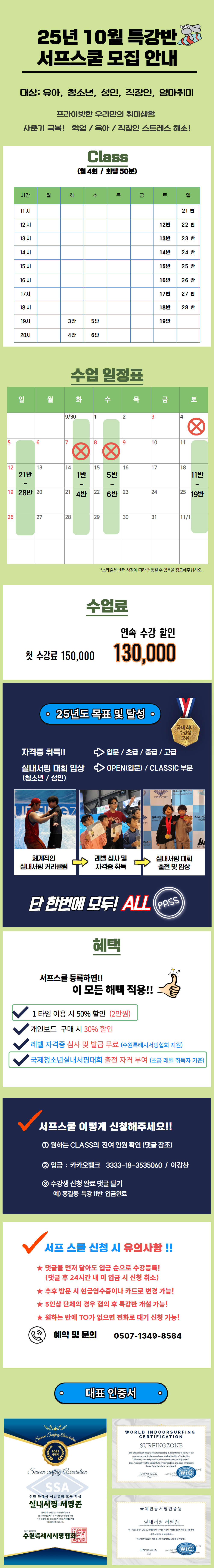 * 10월은 추석연휴 관계로 10/3~10까지 서프스쿨 수업이 없습니다.